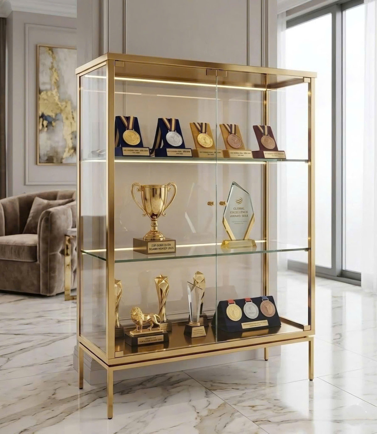 Đây là dòng tủ trưng bày huy chương cao cấp tại Savax Luxury. Khung inox 304 được gia công chính xác, kết hợp công nghệ mạ màu PVD (vàng gương, vàng hồng, đen,…) tạo nên vẻ ngoài cực kỳ sang trọng. Loại tủ này phù hợp với khách hàng yêu thích phong cách cao cấp, các showroom trưng bày hoặc bạn muốn tạo góc trưng bày trong biệt thự, nhà phố.